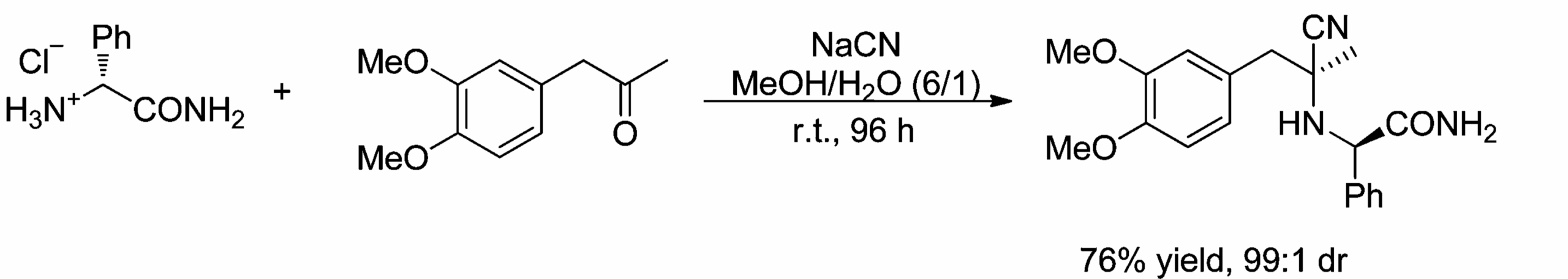 What I find really funny is that chiral amino acids themselves can be used as chiral auxiliaries! Below is a diastereoselective Strecker synthesis with (R)-phenylglycine amide. [9]
