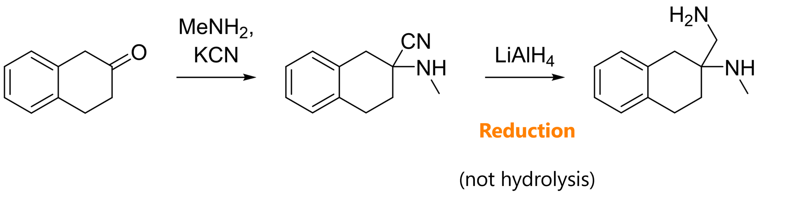 The next example shows that our first synthetic intermediate, the α-amino nitrile, can also be used for other reactions [5]. Instead of acidic hydrolysis, the nitrile can also be reduced to the amine with lithium aluminium hydride.